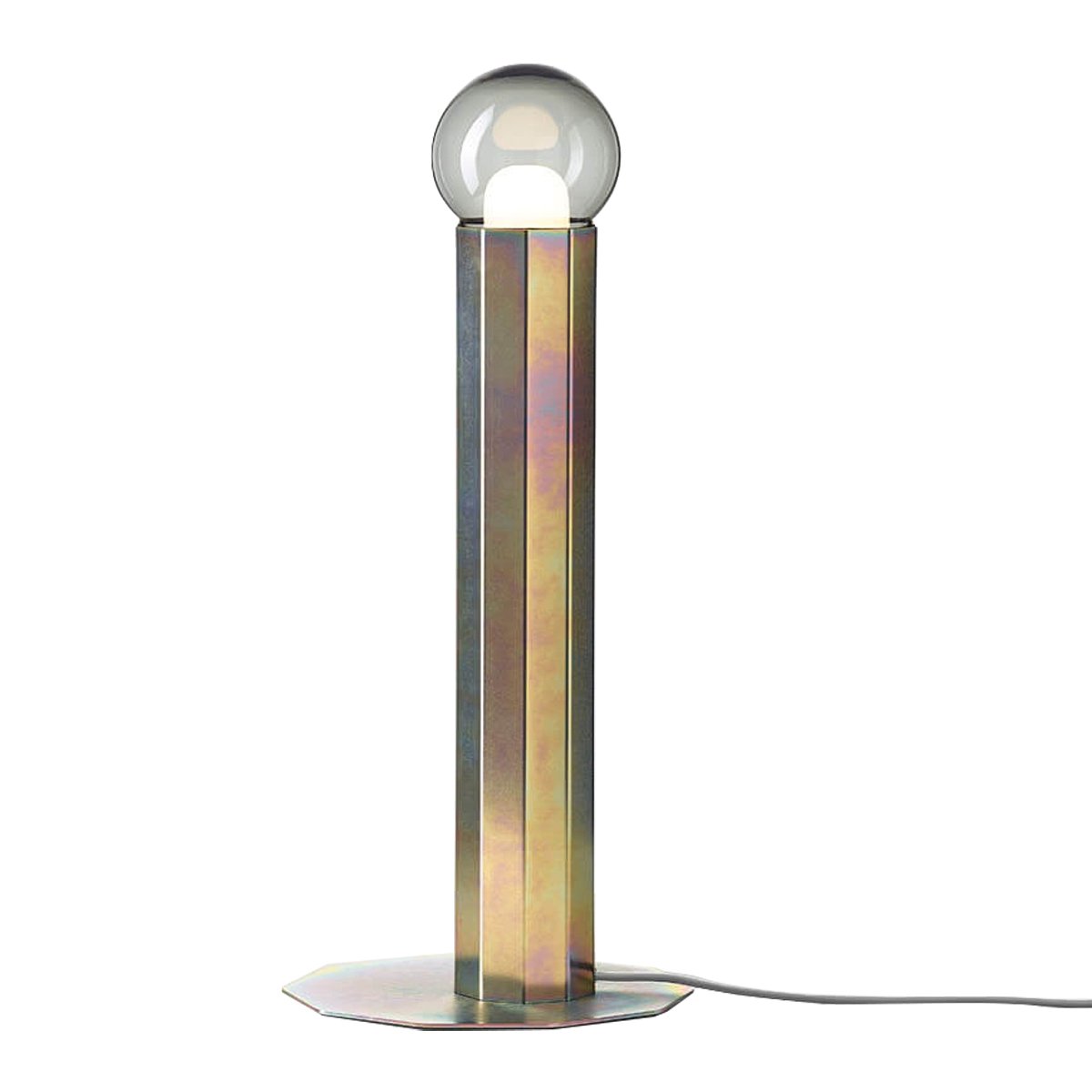 Deze tafellamp heeft een open bol als lampenkap waarbij in